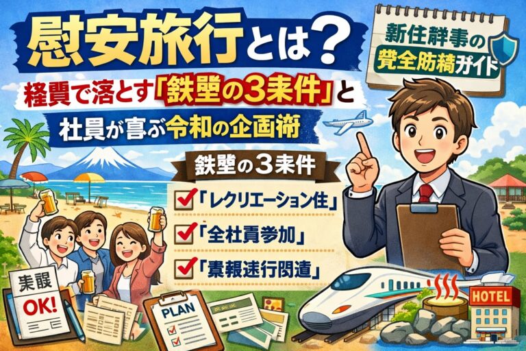 [著者情報] 執筆者:徳永 誠(とくなが まこと) 組織開発コンサルタント(元・大手企業総務部長) 20年間にわたり、延べ300社以上の社内イベントを監修。現役時代から現在に至るまで、監修した慰安旅行における「税務調査での否認ゼロ」を更新中。かつて自身も若手幹事として「上司と現場の板挟み」に悩んだ経験から、実務と心理の両面に寄り添ったアドバイスを信条としている。 「佐藤さん、初めての慰安旅行の幹事 […]