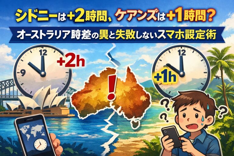 「オーストラリアは日本との時差が少なくて楽」 ……そう思って安心していませんか? 実は、初めてオーストラリアを訪れる方が最も陥りやすい落とし穴が、シドニーとケアンズを周遊する際に現れる「1時間の壁」です。 シドニーがあるニューサウスウェールズ州と、ケアンズがあるクイーンズランド州では、夏の間だけ時差が発生します。 この記事では、現地で実際に起きた失敗談をもとに、予約ミスを防ぐための時差計算とスマホ […]