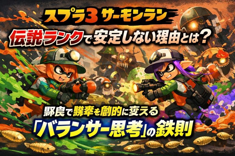 「達人+3」と「伝説」の間を行き来して、なかなか評価が安定しない。 野良(知らない人とのマッチング)でプレイしていると、味方の動きに振り回されて連敗してしまう――。 そんな悩みを抱えていませんか? スプラトゥーン3のサーモンランにおいて、伝説ランクで安定してクリアし続けるためには、単にシャケを倒す技術だけでは足りません。 必要なのは、味方の動きを瞬時に判断し、不足している役割を自分が […]