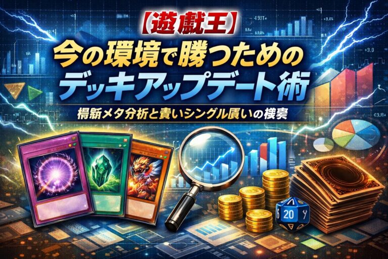 「昔使っていた自慢のデッキで大会に出たけれど、手も足も出ずに負けてしまった……」 そんな経験はありませんか? かつての遊戯王OCG(オフィシャルカードゲーム)は、1枚のカードで1枚を破壊する「1対1の交換」が基本でした。 しかし、現代の遊戯王OCGは、墓地や除外状態すらリソースとして活用し、1枚の初動から盤面を埋め尽くす「リソース循環型」のゲームへと進化しています。 今の環境で勝つた […]
