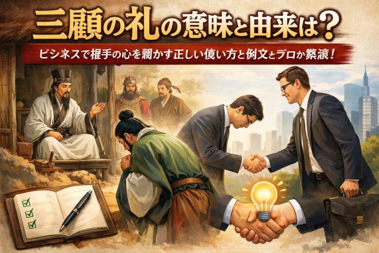 「上司が会議で『三顧の礼で迎えるべきだ』と言っていたけれど、正確にはどういう意味だろう?」 「優秀なエンジニアを勧誘したいけれど、三顧の礼という言葉をメールで使っても失礼にならないかな?」 ビジネスの現場で耳にする「三顧の礼(さんこのれい)」という言葉。なんとなく「熱心に誘うこと」というイメージはあっても、その正確な由来や、現代ビジネスにおける正しいマナーまで自信を持って答えられる人は意外と少ない […]