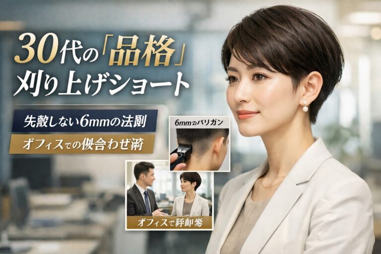 「今のショートヘア、なんだかマンネリ気味……。でも、刈り上げに挑戦するのはボーイッシュになりすぎそうで怖い」 そんな不安を抱えていませんか? おしゃれを楽しみたいけれど、オフィスでの品格も失いたくない30代女性にとって、襟足をスッキリさせる「刈り上げショート」は非常に勇気がいる選択肢かもしれません。 しかし、プロの視点から断言します。 大人の女性の刈り上げショートは、適切な「ミリ数」と「質感」さえ […]