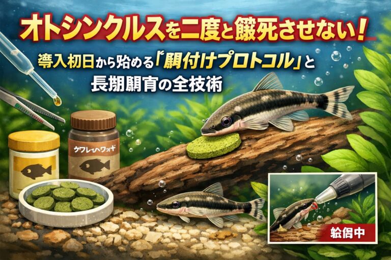 「水槽のコケ取り名人」として人気の高いオトシンクルスですが、飼育を始めて数週間で、いつの間にか姿が見えなくなったり、痩せて死んでしまったりした経験はありませんか? もしあなたが「自分の管理不足で死なせてしまった」と自分を責めているなら、どうか安心してください。 オトシンクルスの長期飼育に失敗する原因の多くは、あなたの愛情不足ではなく、この魚特有の「餓死のメカニズム」が正しく知られていないことにあり […]