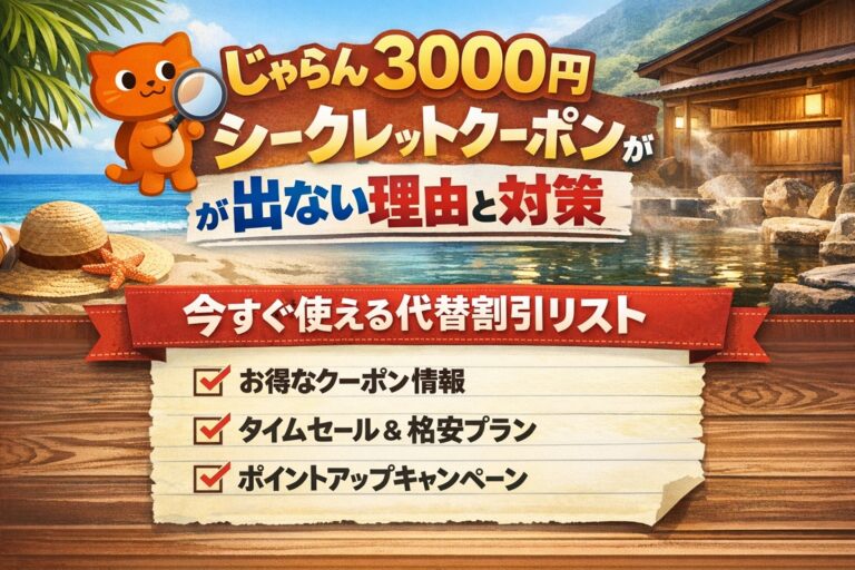 「予約ボタンを押す直前なのに、お目当ての3000円クーポンが見当たらない……」と、焦っていませんか? せっかくの旅行、少しでも安く予約して現地でのランチを豪華にしたいという気持ち、本当によくわかります。 しかし、じゃらんの3000円シークレットクーポンは、すべての人に一斉配布されるものではありません。 この記事では、元旅行代理店勤務の私が、あなたの画面にクーポンが表示されない「本当の理由」を3分で […]