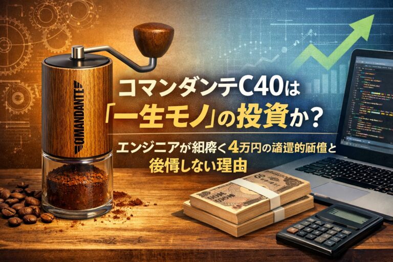 「コーヒーミルに4万円も出すのは、果たして正気だろうか?」 もしあなたが、私と同じように論理的なスペックと投資対効果を重視するエンジニア気質の持ち主なら、そう疑うのは当然です。 1万円も出せば立派な電動ミルが買える時代に、あえて手動の「コマンダンテC40」を選ぶことには、単なる趣味を超えた「合理的な理由」が必要です。 結論から申し上げます。 コマンダンテC40は、コーヒー抽出における「再現性」とい […]