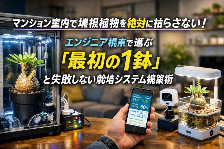 SNSで見かけた、彫刻のように力強く、個性的な造形を持つ「塊根植物(コーデックス)」。 その魅力に惹かれ、「自分の部屋にも置いてみたい」と考えている方は多いはずです。 しかし同時に、「数万円もする高価な植物を、マンションの室内ですぐに枯らしてしまったらどうしよう」という不安も抱えているのではないでしょうか。 結論から申し上げます。塊根植物の栽培の成否は、個人のセンスや愛情の量ではなく、「光・風・水 […]