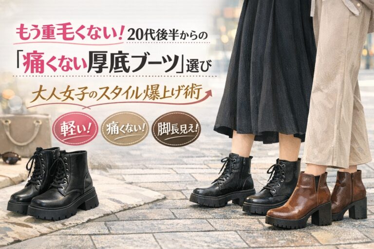 「スタイルを良く見せたいけれど、厚底ブーツは重くて足が痛くなりそう……」 「20代後半になって厚底を履くと、子供っぽく見えないか不安」 と悩んでいませんか? 結論からお伝えします。 最新の「軽量素材」と「チェルシー型(サイドゴア)」のデザインを選べば、厚底ブーツはスニーカーよりも楽にスタイルアップできる最強の味方になります。 かつて私自身も、デザインだけで選んだ重いブーツで靴擦れに泣 […]