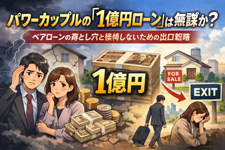 モデルルームに足を運び、営業担当者から「世帯年収1,600万円の佐藤さんご夫妻なら、1億円の物件もペアローンで十分に手が届きますよ」と太鼓判を押される。 そんな高揚感の裏で、「本当に35年間、この返済を続けられるのだろうか?」という拭いきれない不安を抱えてはいませんか? 結論から申し上げます。 パワーカップルによる1億円の住宅ローンは、数字上は「可能」ですが、ペアローン特有の構造的リスクと、10年 […]