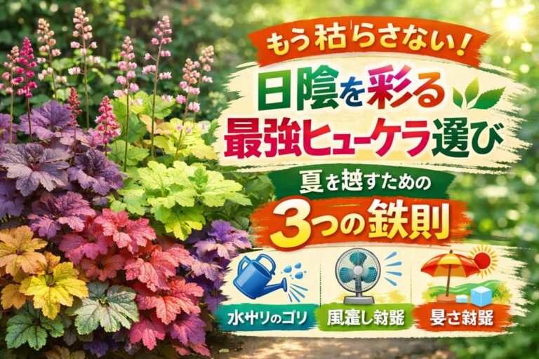 園芸店の店先に並ぶ、赤、紫、ライムグリーン……。 宝石のように色鮮やかなヒューケラの苗を前にして、「なんて綺麗なんだろう!」と胸を躍らせたことはありませんか? でも、ふと我に返ってこう思うはずです。 「うちは北向きで日当たりが悪いけれど、本当に育つのかな?」 「種類が多すぎて、どれを選べばいいかわからない」 「去年は夏に枯らしちゃったし……」 せっかくお迎えするなら、今度こそ長く、美しく育てたいで […]