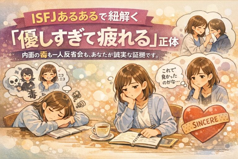 [著者情報] 美緒(Mio) 心理カウンセラー(MBTI認定ユーザー)。元・燃え尽き事務職。 自身もISFJであり、過剰適応による休職を経験。「優しすぎる自分」に振り回されるISFJの味方として、理論と共感の両面から心のケアを行う。 昨日の飲み会、本当にお疲れ様でした。 周囲のグラスの空き具合をさりげなくチェックし、会話が途切れないよう気を配り、誰かが寂しそうにしていればそっと隣に移動する……。 […]