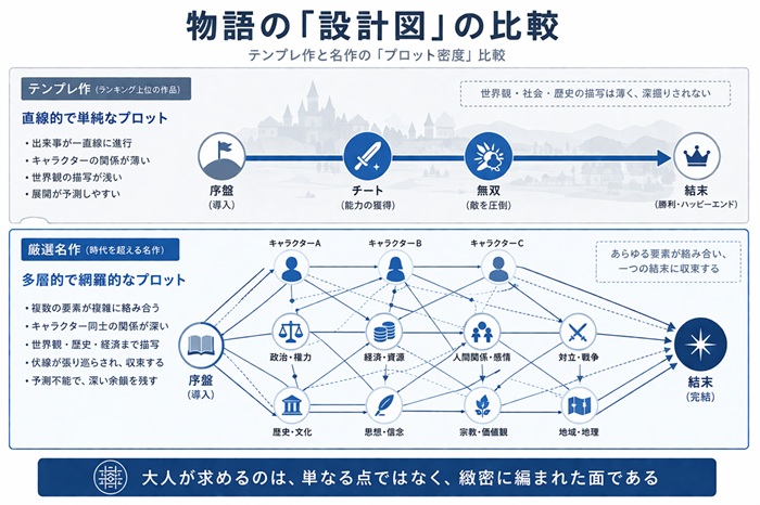 読者の即物的な快感を優先するため、長期的な伏線や緻密な世界観構築(仕様策定)は、むしろ「テンポを損なうノイズ」として切り捨てられる傾向にあるのです。