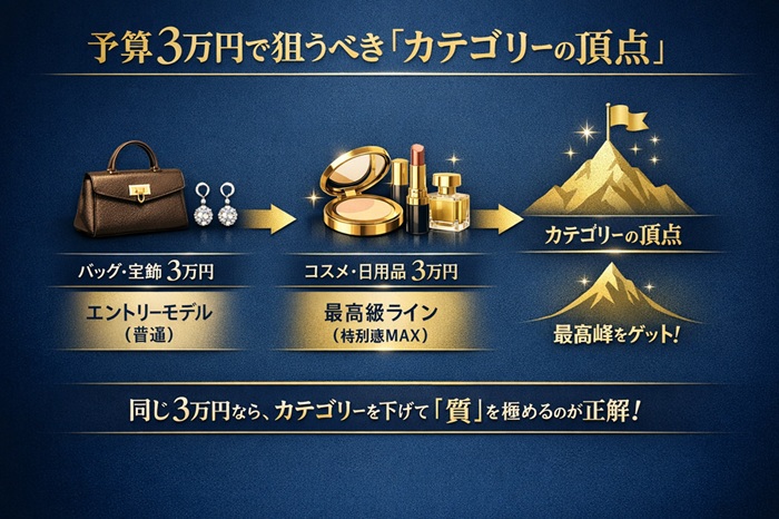 これは、バッグやジュエリーといった高額カテゴリーでは「入門編」に過ぎない3万円という予算を、あえてコスメや日用品といった「単価の低いカテゴリー」に投入することで、その分野における「世界最高峰の品」を手に入れる戦略です。