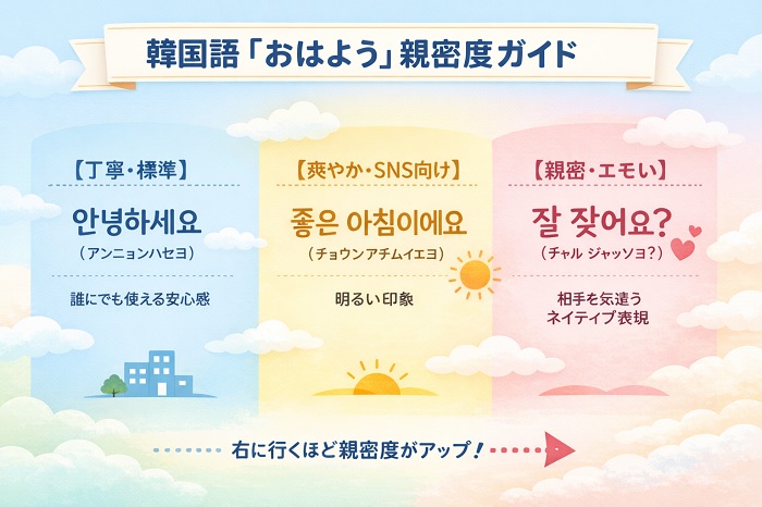 - 親しみを込めるなら「잘 잤어요?(チャル ジャッソヨ?)」で安否確認。