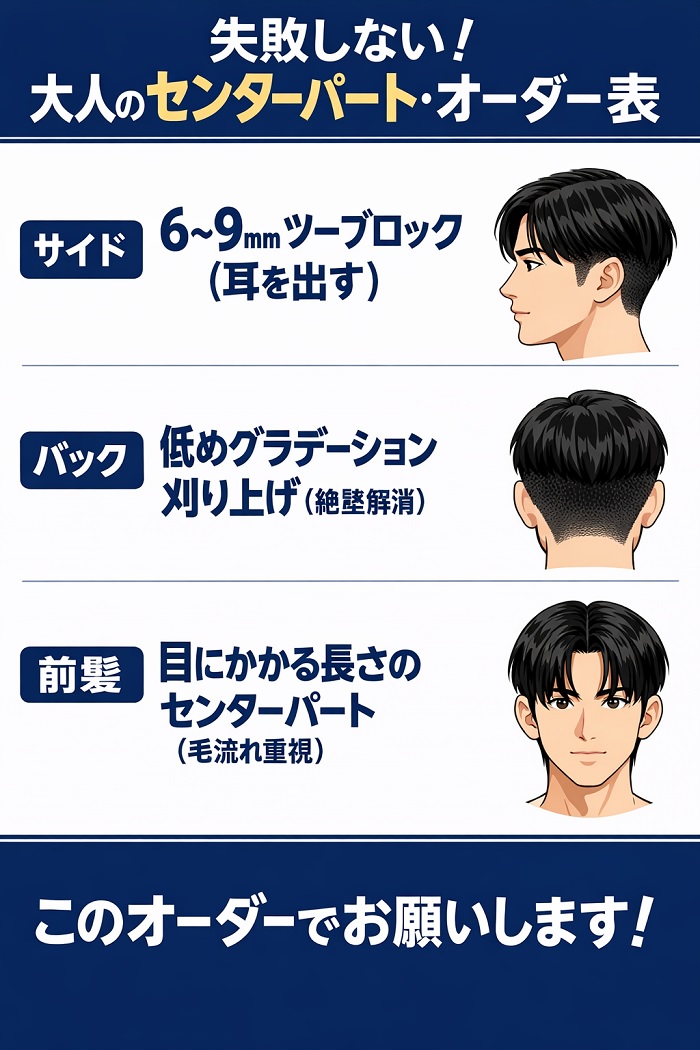 - トップ・前髪: 「センターパートにしたいので、前髪は目にかかるくらいの長さで残し、後ろに流れるように重さを調整してください」