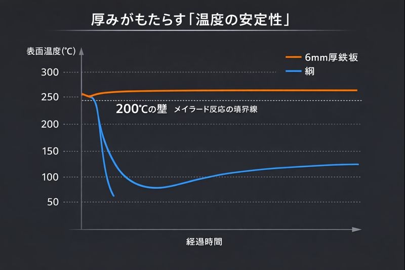 キャンプで一般的な「網」や薄い鉄板の場合、冷たい肉を置いた瞬間に表面温度が急激に低下します。