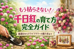 ホームセンターの園芸コーナーで、ポンポンのような可愛らしい姿に一目惚れして連れて帰ってきた「千日紅(センニチコウ)」。 でも、以前に別の花をすぐに枯らしてしまった経験があると、「今回も私のせいでダメにしてしまうかも……」と、お水をあげる手さえ少し不安になってしまいますよね。 こんにちは、園芸コンシェルジュのハルです。 実は、今でこそドライフラワー作家として活動している私も、かつては「枯らし名人」で … 続きを読む もう枯らさない!千日紅の育て方完全ガイド|苗選びからドライフラワーの飾り方まで