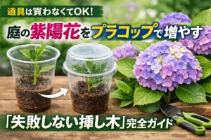 「庭に咲いた綺麗な紫陽花(アジサイ)を、もっと増やして別の場所にも植えたい。でも、専用の道具を買い揃えるのは大変そう……」 そんな風に思っていませんか? 実は、紫陽花を増やすのに高価な道具や薬剤は必ずしも必要ありません。 結論からお伝えすると、6月の「梅雨」という季節と、キッチンにある「透明なプラコップ」さえあれば、初心者の方でも高い確率で紫陽花の苗を作ることができます。 この記事では、私が20年 … 続きを読む 道具は買わなくてOK!庭の紫陽花をプラコップで増やす「失敗しない挿し木」完全ガイド