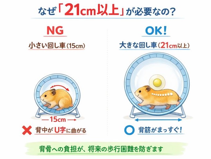 体が大きいキンクマが小さな回し車を使うと、背中が反り返ってしまい、背骨の変形や痛みを引き起こします。適切なサイズの回し車は、キンクマの健康維持だけでなく、ストレス発散による「噛み癖」の防止にも直結します。