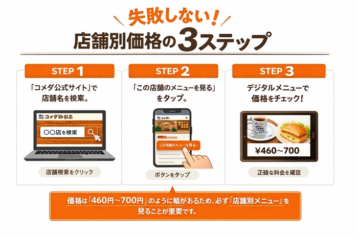 現地でメニューを開いてから「予算オーバーだ」と焦らないために、以下の3ステップで事前に価格を特定しておきましょう。