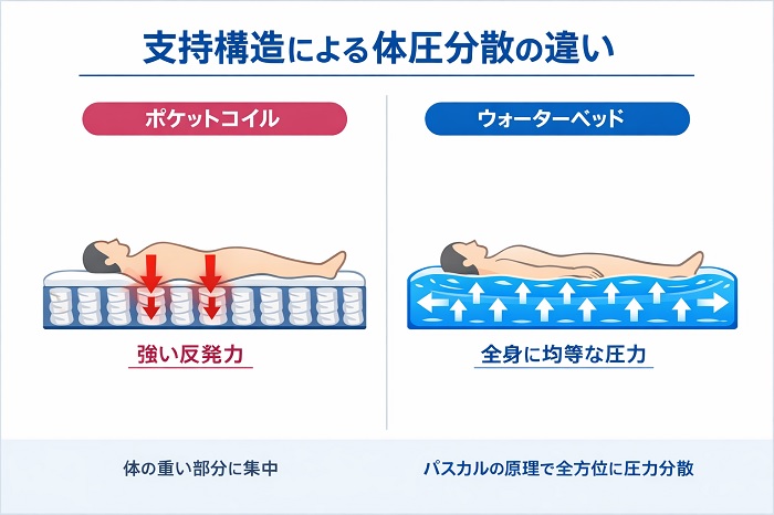 一方で、ウォーターベッドが採用している「パスカルの原理」は、この問題を根本から解決します。