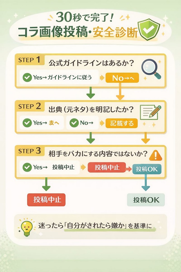 - 公式のガイドラインを確認したか?: 最近は、アニメやアイドルの公式が「二次創作ガイドライン」を出していることが多いです。二次創作ガイドラインと肖像権の関係では、公式の許可が法的リスクを上書きする強力な指針になります。