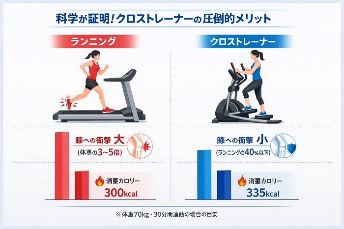 【結論】クロストレーナーは、膝への衝撃をランニングの約40%以下に抑えつつ、全身の筋肉を動員することで同等以上のカロリーを消費できる「究極の有酸素マシン」です。