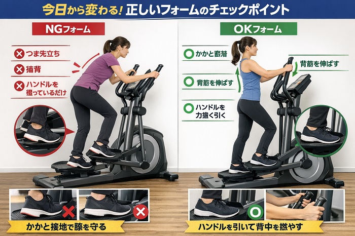 【結論】膝を守るためには「かかとを浮かせないこと」、脂肪燃焼を最大化するには「ハンドルをしっかり引くこと」が不可欠です。