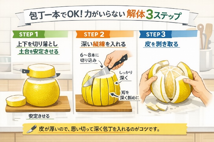 晩白柚の「厚い皮」と「縦の切り込み」の関係を理解すれば、力任せに格闘する必要はありません。