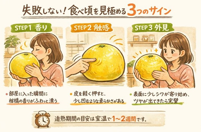晩白柚にとって、「追熟(ついじゅく)」と「食味・香り」は切っても切れない関係にあります。