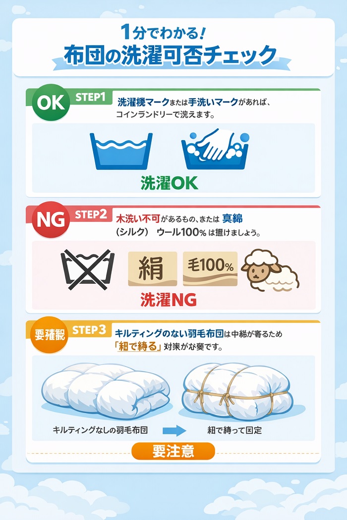 - 洗濯表示をチェック(水洗い不可と和布団は避ける)