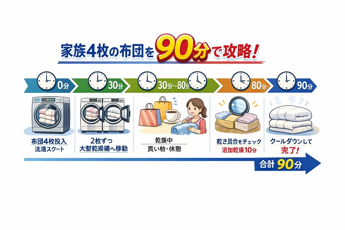 実は、「洗濯機1台+乾燥機2台」を同時に使いこなすことで、4枚の布団をわずか90分で終わらせることができます。