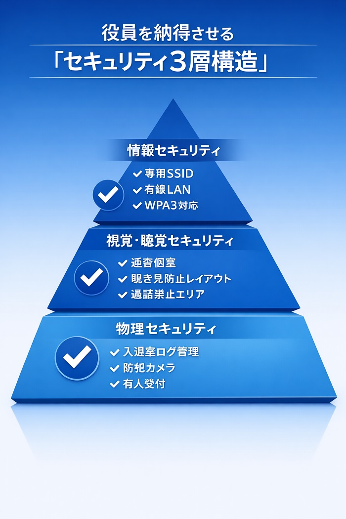 シェアオフィスのセキュリティは、物理・視覚・情報の3つの階層で評価する必要があります。