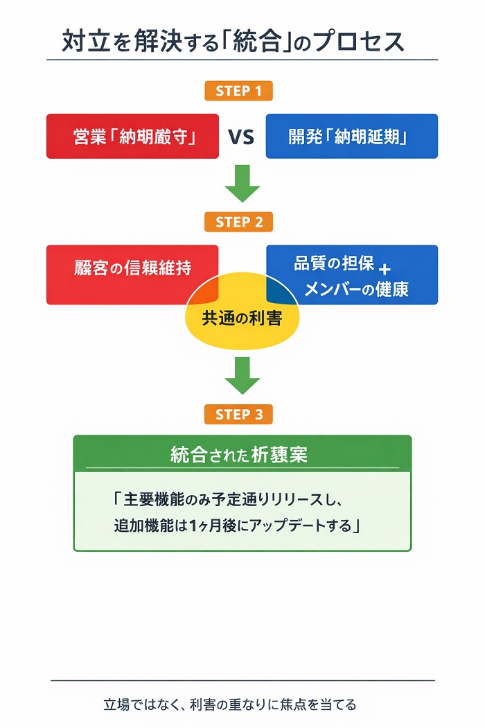 「折衷案」とは、本来お互いの条件を削り合う「妥協」ではなく、双方の真の目的を同時に達成する「統合」であるべきなのです。