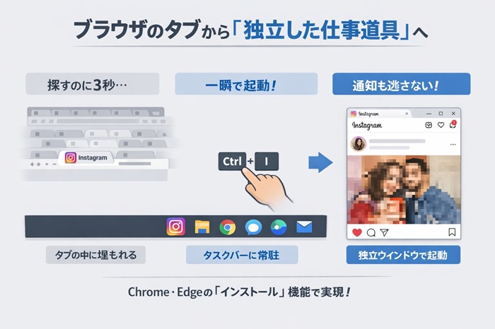 - PWAの導入: インスタをブラウザのタブから独立させ、1クリックで起動する「専用ツール」に変える。