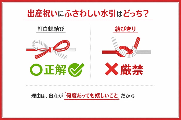 出産祝いにおいて、「紅白の蝶結び(花結び)」と「結びきり」は全く異なる意味を持ち、間違えると大変失礼にあたります。