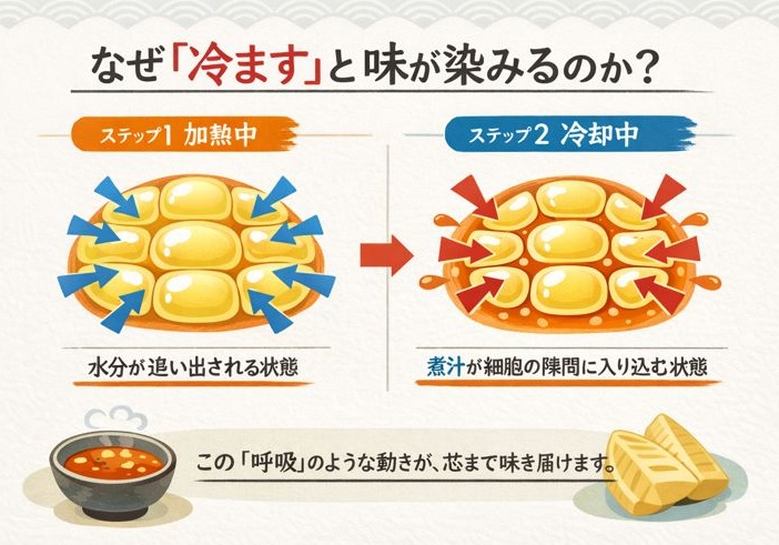 逆に、温度が下がっていく過程では、細胞が収縮し、周囲にある煮汁をギュッと吸い込もうとする性質があります。