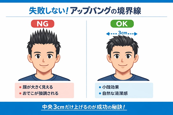 アップバングにおいて、前髪の上げ方と顔の露出面積のバランスは、第一印象を左右する極めて重要な関係にあります。