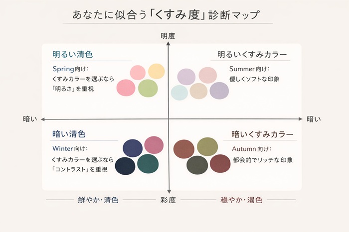 - 自分の「くすみ限界」を知る: 明度と彩度のバランスで、得意な範囲を特定する。