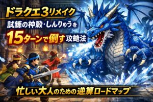 「レベルを60まで上げたのに、しんりゅうの圧倒的な火力の前に数ターンで全滅してしまった……」 そんな絶望を感じてスマホを手に取ったあなたへ。 かつてオリジナル版で勇者だった私たちが、大人になって直面する「試練の神殿」は、単なるレベル上げだけでは突破できない高い壁です。 結論から申し上げます。 しんりゅう戦の勝敗を決めるのは「レベルの数値」ではなく、「装備による耐性」と「15ターンから逆算した行動の … 続きを読む 【ドラクエ3リメイク】試練の神殿・しんりゅうを15ターンで倒す攻略法|忙しい大人のための逆算ロードマップ