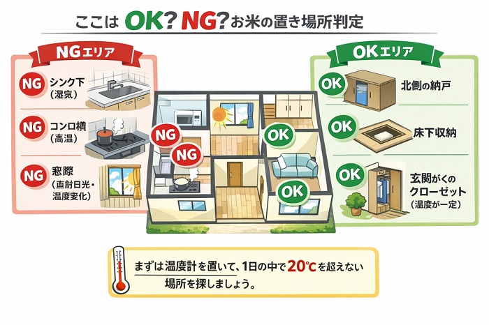お米の含水率は約14〜15%で安定していますが、湿度が上がるとカビが発生し、逆に乾燥しすぎるとお米が割れて炊き上がりがベチャついてしまいます。キッチンシンク下は配管の湿気が溜まりやすいため、絶対に避けてください。 - 酸素:酸化を止める物理的遮断
