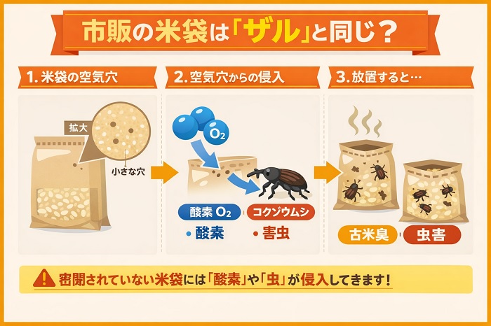米袋と空気穴の関係は、いわば「呼吸のための窓」ですが、この窓が保存においては最大の弱点となります。