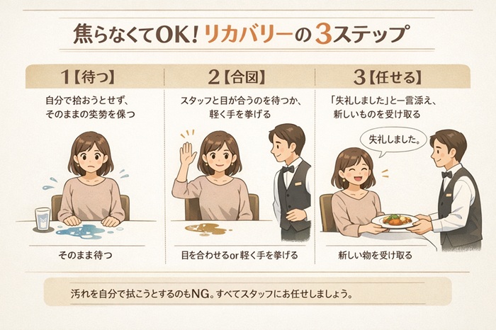 高級レストランにおいて、カトラリーの落下や食べこぼしといったトラブルは、すべてスタッフに任せるべき領域です。