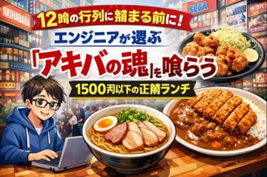 [著者情報] アキバ飯リサーチャー・サトウ 秋葉原ランチ探求歴15年。元PCパーツ誌の編集者として、締め切り間際の「早くて旨くてガッツリ」な飯を求めて秋葉原の路地裏を500軒以上踏破。現在はガジェットメディアでグルメ連載を持ち、行列の動態予測に基づいた「待ち時間ゼロ」のランチ戦略を提唱している。 11:45。電気街のパーツショップで目当ての基板を手に入れ、店を出た瞬間に襲ってくる強烈な空腹感。 ス … 続きを読む 12時の行列に捕まる前に!エンジニアが選ぶ「アキバの魂」を喰らう1500円以下の正解ランチ