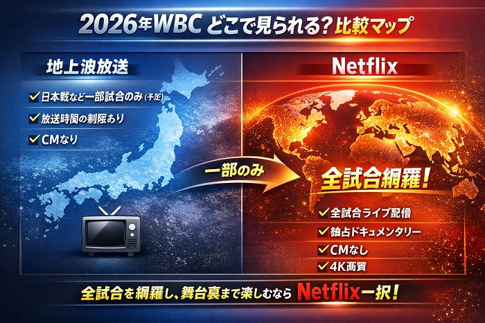 地上波放送については一部の試合に限定される可能性が高いため、「全試合を確実に、最初から最後まで見たい」というファンにとって、Netflixは避けては通れない選択肢となりました。