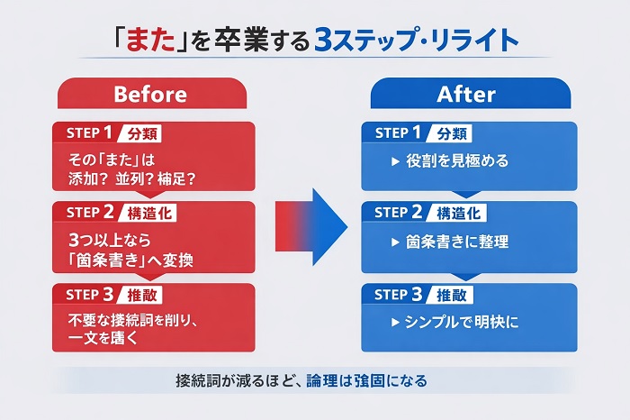 不要な「また」を削ることで、文章にリズムと力強さが生まれます。