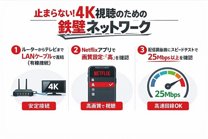 また、4K画質を安定させるには、Netflix公式が推奨する25Mbps以上の通信速度を維持しなければなりません。