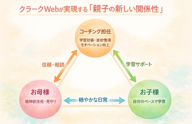クラークWebは、不登校のお子様を持つお母様が「先生役」という重荷を下ろし、親子関係を修復しながら、お子様が自立して卒業を目指せる場所です。