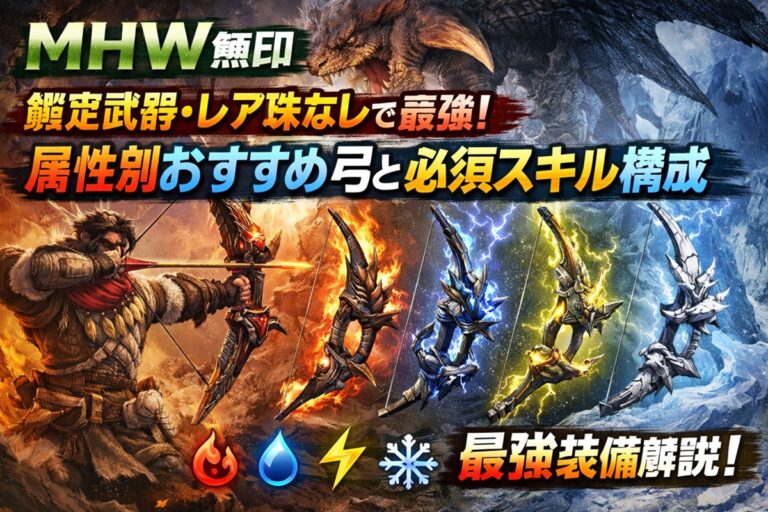 「マルチプレイで自分だけモンスターへのダメージが1桁や2桁前半しか出ていない……」 「周りの弓使いはあんなにスタイリッシュに火力を出しているのに、自分の何が悪いんだろう?」 そんな風に、集会エリアで一人、装備画面を見つめて溜息をついていませんか? 実は、モンスターハンター:ワールド(MHW)における弓は、全武器種の中でもトップクラスの火力を秘めていますが、その性能を引き出すには「ある絶対的な法則」 […]