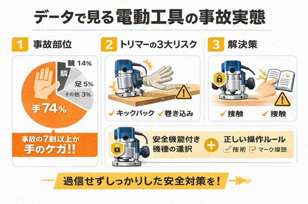 特にトリマーのような切削工具では、材料が弾け飛ぶ「キックバック」や、回転する刃への接触が重篤な怪我に直結します。