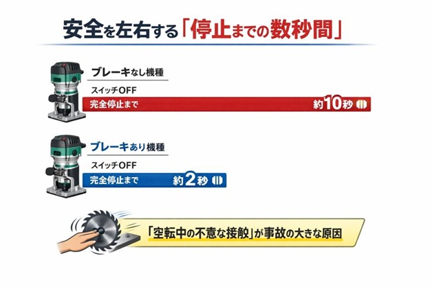 ブレーキがない機種は停止まで10秒近く空転し続けますが、ブレーキ付きならわずか2秒ほどで停止します。この「停止までの時間差」が、作業後の不意な接触事故を防ぐ決定的な差となります。